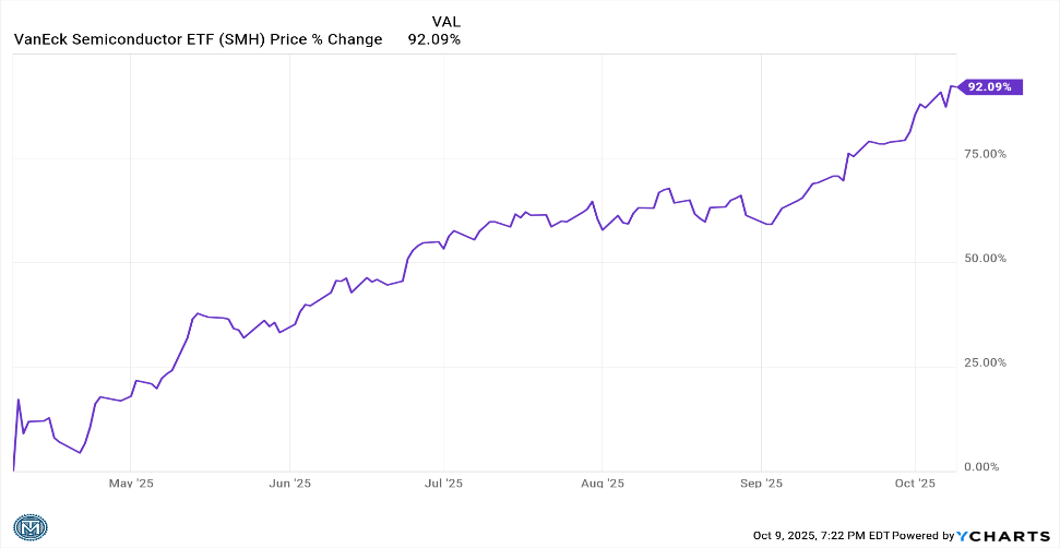 Historically, September is a difficult month for stocks. Market started to anticipate this by flattening out in mid-August, but positive interest rate news sent the market soaring again after Labor Day. I have learned over decades in this business to be nervous when investors get this ebullient, but I know I’m never get the exact timing of a market top. If one leaves the party too early, one can miss a lot. The S&P 500 has provided outstanding returns since 2012, so if one is going to go against the big technology names that lead this index, one better be very sure of both their thesis and their timing (and I am not). I just know that trees don’t grow to the sky. A couple of charts of hot sub-sectors show just how far and how fast we’ve run up: