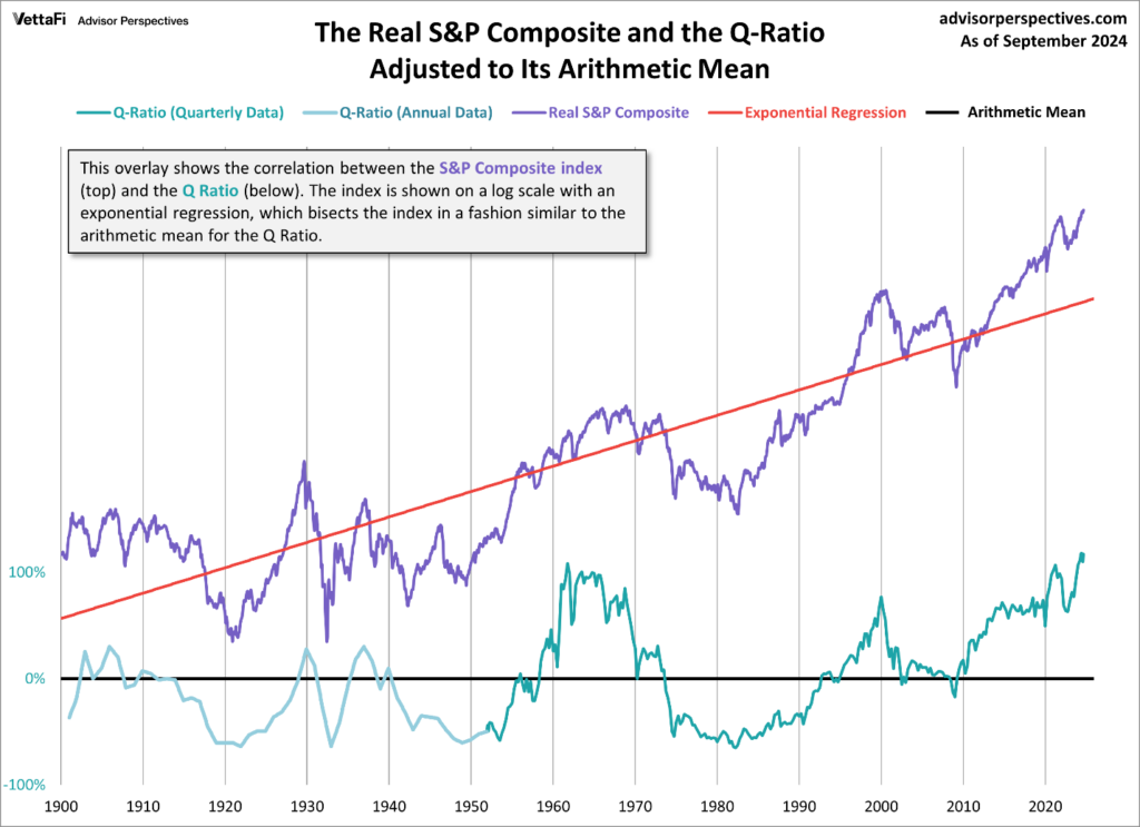 The chart below references the Q-Ratio for the S&P 500. Tobin’s Q is a measure of stock prices relative to replacement value. In essence it argues that you could build a new Apple or Nvidia far cheaper than it would cost you to buy up all the company’s stock. Which is over $3.5 trillion each, if you were wondering.